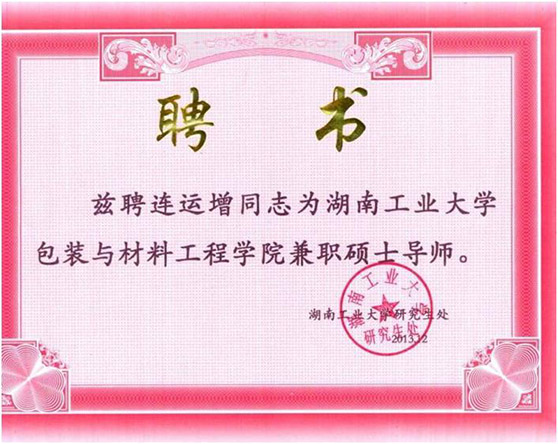 公司总经理连运增先生担任研究生孙兆飞的兼职硕士导师,指导其在企业完成包装新材料与技术方向的相关研究,取得了预期业绩成果。